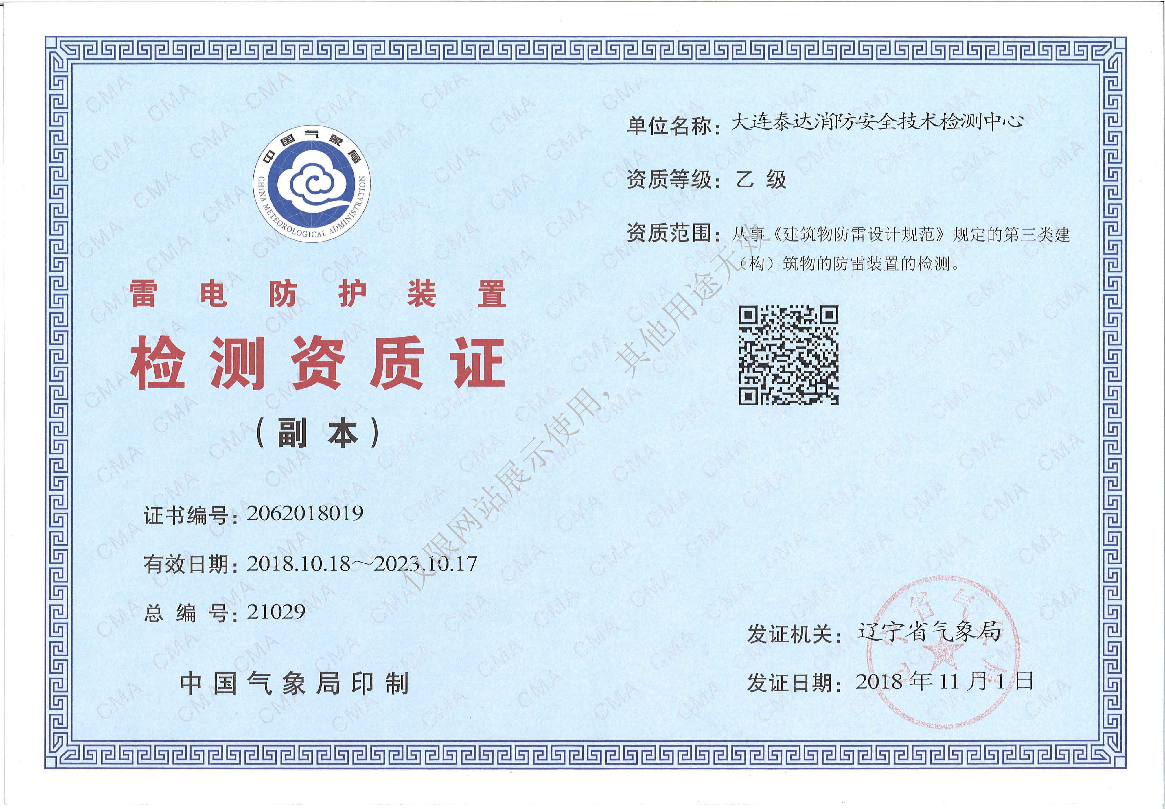 · 是經(jīng)“社會消防技術(shù)服務(wù)信息系統(tǒng)”備案并公示的消防技術(shù)服務(wù)機(jī)構(gòu),已取得中國氣象局頒發(fā)的雷電防護(hù)裝置檢測資質(zhì)證書、遼寧省質(zhì)量技術(shù)監(jiān)督局審核批準(zhǔn)的檢驗檢測機(jī)構(gòu)資質(zhì)認(rèn)定證書(CMA)及包括消防檢測、電氣檢測、雷電防護(hù)裝置檢測、防火涂層厚度檢測等在內(nèi)的200余項檢驗檢測能力,取得大連市應(yīng)急管理局頒發(fā)的安全生產(chǎn)標(biāo)準(zhǔn)化證書,獲得質(zhì)量管理體系、環(huán)境管理體系、職業(yè)健康安全管理體系認(rèn)證證書,是經(jīng)備案的高新技術(shù)企業(yè),可獨(dú)立出具具有證明作用的檢測報告。